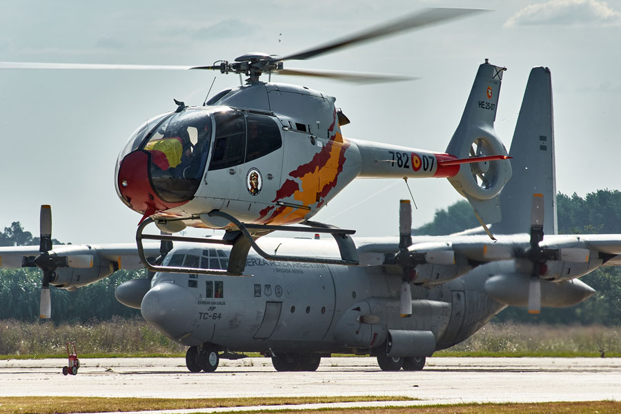 Las primeras aeronaves en tomar contacto con la pista de la I Brigada fueron los helicópteros Eurocopter EC-120B Colibrí, de la Patrulla Aspa, cuyo espectáculo aéreo ya había sido presentado en Uruguay y Brasil como parte del itinerario de su gira sudamericana.