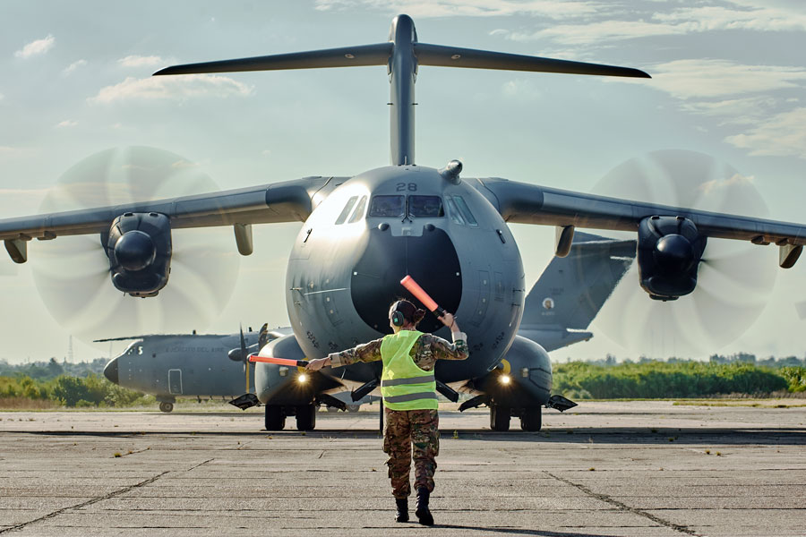 Posteriormente, arribaron dos aeronaves de transporte Airbus A400M, que trasladaron a las autoridades del Ejército del Aire y del Espacio que integran la comitiva oficial.