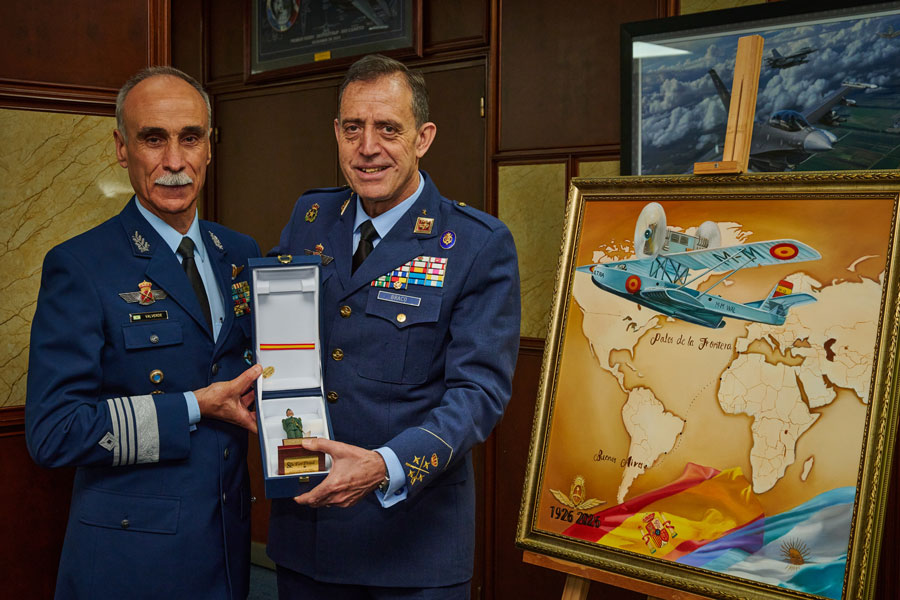 En esta oportunidad, el oficial español también saludó a las máximas autoridades de la Institución y mantuvo una reunión privada con el brigadier mayor Valverde donde firmó el libro de visitas e intercambiaron presentes institucionales entre los que se encontraba un cuadro representativo de la hazaña del hidroavión.
