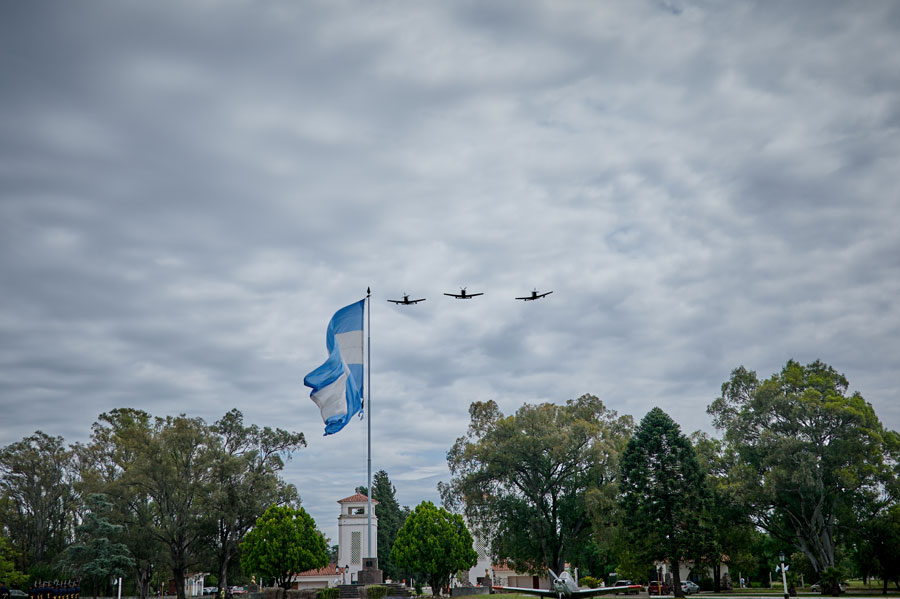 Seguidamente, los cadetes y oficiales de la Escuela de Aviación Militar iniciaron el desfile terrestre. Para sellar este momento también se efectuó el pasaje del Sistema de Armas Beechcraft T-6C Texan II.