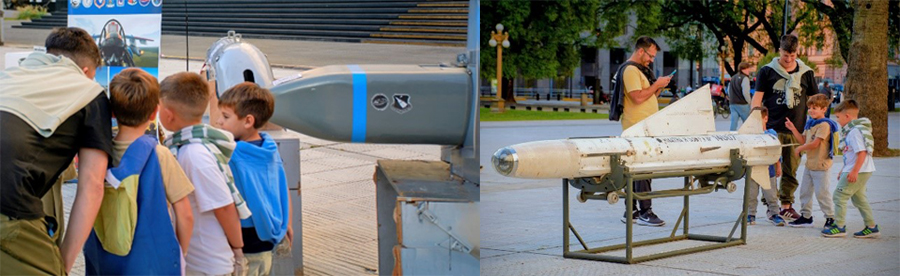 Entre los objetos exhibidos pertenecientes al Museo Nacional de Aeronáutica se destacaron un misil Matra completo, un asiento eyectable, material didáctico, una mochila con paracaídas, una maqueta del Sistema de Armas Mirage con el esquema malvinero y una maqueta de la aeronave F-86 Sabre seccionado con turbina a la vista, entre otros.