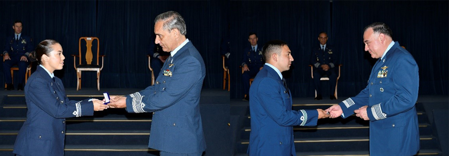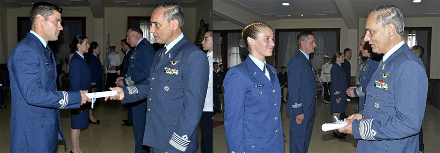 La ceremonia continuó con la lectura de la resolución de egreso y la entrega de los despachos a cada uno de los oficiales egresados. Al finalizar, el comodoro Marcelo Agosto entregó los premios al personal militar que obtuvo los dos primeros promedios de egreso, que fueron recibidos por la primer teniente Florencia Maylén González y el primer teniente Oscar Alberto Giménez.
