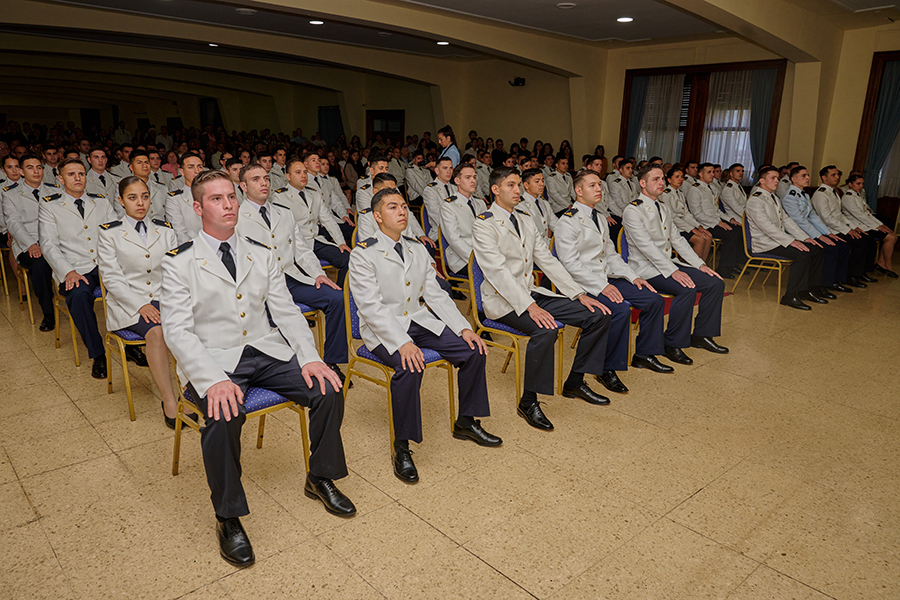 A continuación, el jefe del Estado Mayor General de la Fuerza Aérea Argentina, brigadier Gustavo Javier Valverde brindó unas palabras alusivas en las que reconoció el esfuerzo y dedicación de los futuros oficiales de la Institución: “Hoy es un día trascendental, porque hoy ustedes jóvenes alféreces, se integran al cuadro de oficiales de la Fuerza Aérea Argentina; ustedes empiezan a partir de ahora a transitar lo que es la vida militar. En estos cuatro años recibieron una formación para poder llegar este día, pero a partir de ahora tienen la gran responsabilidad de seguir capacitándose, seguir transitando día a día con esfuerzo, con dedicación, con compromiso, porque sobre sus espaldas va a caer la responsabilidad de ser los futuros conductores de la Fuerza Aérea Argentina”.